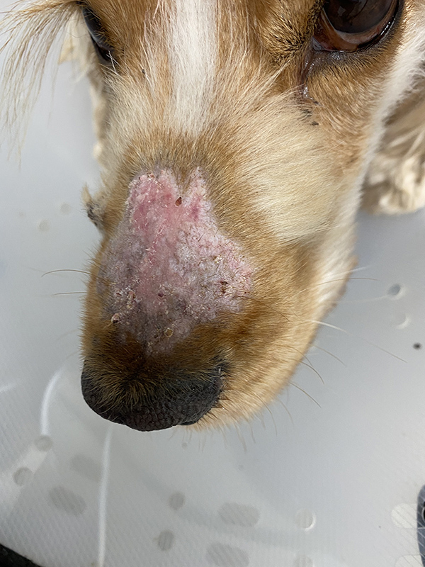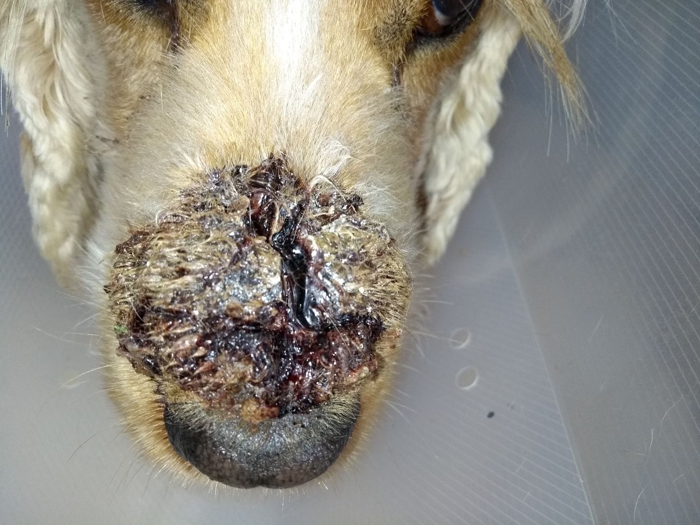 Bo’s vet then referred her to Anita, who used the video app to examine the big eruption on the dog’s nose. Anita took lots of photographs of Bo from different angles. She then asked Bo’s own vet to take a sample of cells from Bo’s nose. She prescribed high doses of steroids and carried on with the antibiotics. It took Bo a good six to eight weeks to recover, but her owner says she is fine now.